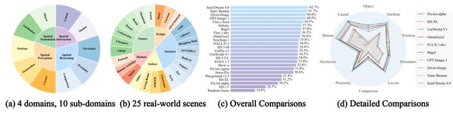 尽管目前文生图模型(Text-to-Image Models)在生成高保真图像上表现卓越,但在应对空间感知、空间逻辑推理及多目标空间交互等贴合现实场景的复杂空间智能任务时往往力不从心。现有评估基准主要依赖简短或信息稀疏的提示词,难以覆盖复杂的空间逻辑,导致模型在这些关键空间智能维度上的能力缺陷被严重低估。
